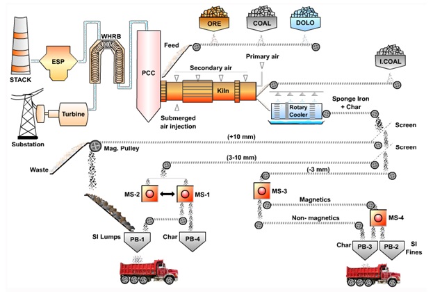 طرح شماتیک کارخانه تولید آهن اسفنجی در شکل زیر آمده است، همانطور که مشخص است واحد اصلی موجود در کارخانه واحدی است که در آن سه مادهی اولیهی سنگ آهن، زغال سنگ و دولومیت با یکدیگر ترکیب میشوند و واکنشهایی بین آنها صورت میگیرد.