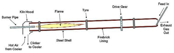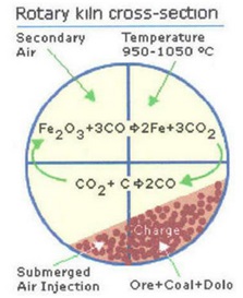 همانطور که در شکل زیر مشخص است تمام واکنشهای صورت گرفته در کورهی استوانهای دوار حول محور خود و دارای شیبی ملایم (زیر 5 درجه) نسبت به زمین، رخ میدهد، سنگ و یا گندله های هماتیتی یا مگنتیتی با محتوی زغال و سنگ آهک و یا دولومیت به کوره گردان وارد شده و ضمن حرکت در خلاف جهت جریان گاز، گرم شده و در دمایی حدود 1100 درجه سانتی گراد تا حدود 92 درصد احیا، و به آهن اسفنجی تبدیل می شوند.